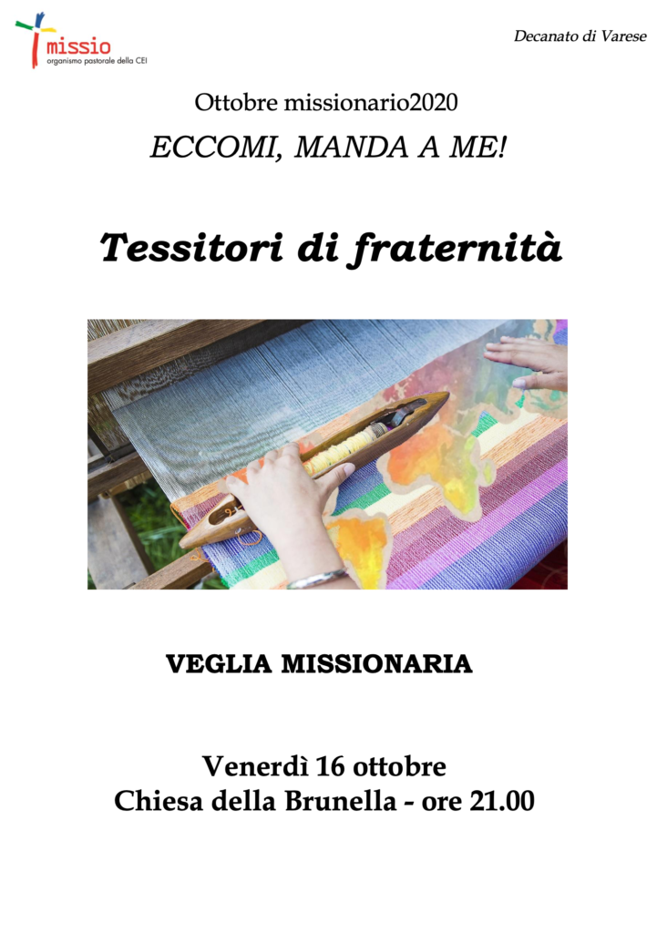15 Ottobre 2020Notizie Comunità Ottobre missionario 2020 – Veglia Missionaria “Tessitori di fraternità”, la Veglia Missionaria che si svolgerà venerdì 16 ottobre 2020 presso la chiesa della Brunella alle ore 21.00. Precedente Articolo Nuovi chierichetti Prossimo Articolo Società San Vincenzo De Paoli - Conferenza di Giubiano