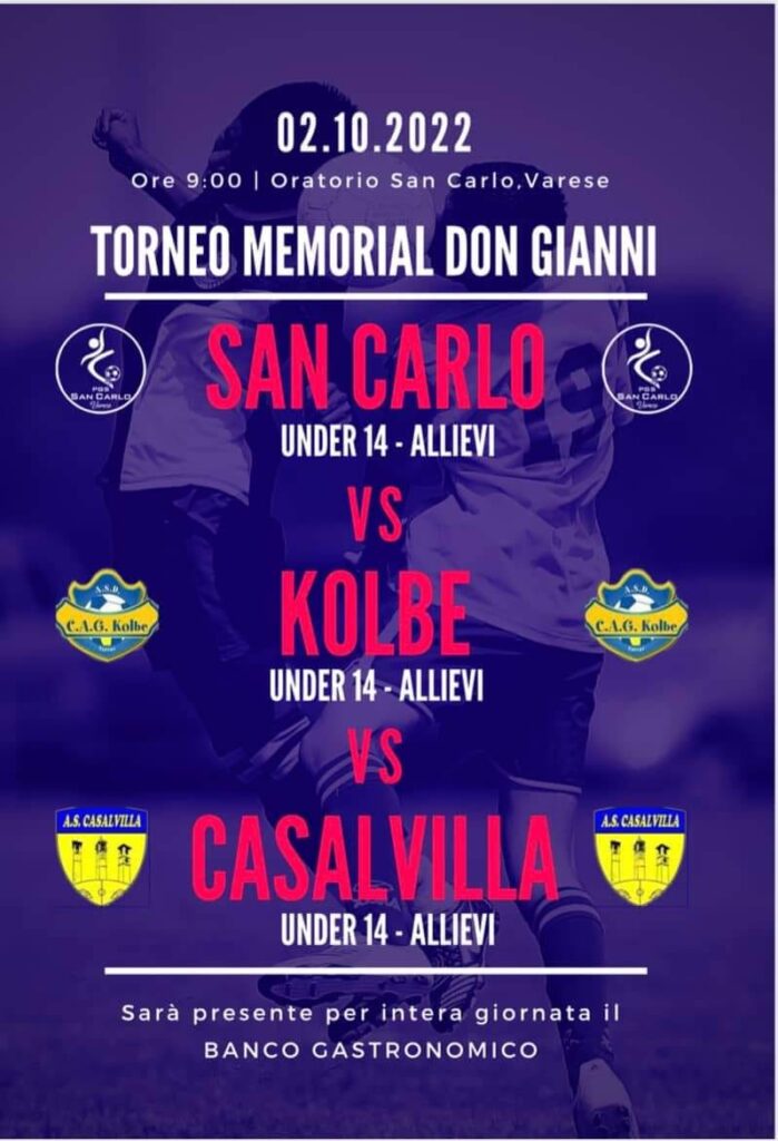 27 Settembre 2022Notizie Comunità, San Carlo Memorial don Gianni 2022 Domenica 2 ottobre alle ore 9.00 presso l’oratorio di San Carlo si terrà il “Torneo Memorial don Gianni”. Sarà presente per l’intera giornata il banco gastronomico. Precedente Articolo Ordinazione di don Vincenzo Attisano Prossimo Articolo Raccolta Caritas ottobre 2022