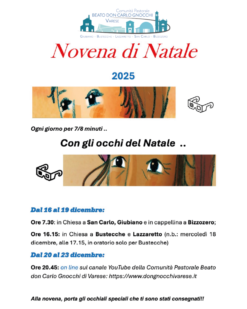 Dal 16 al 19 dicembre aspettiamo i ragazzi la mattina nelle diverse chiese della nostra Comunità per partecipare alla Novena di Natale. Dal 20 al 23 aspettiamo i ragazzi online sul canale YouTube della Comunità Pastorale.