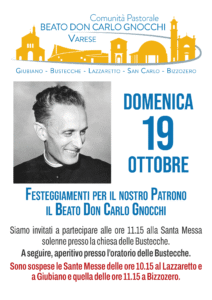 Festeggiamenti per il patrono della Comunità, il Beato don Carlo Gnocchi Siamo invitati a partecipare alle ore 11.15 alla Santa Messa solenne presso la chiesa delle Bustecche. A seguire, aperitivo…